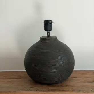 Pied de lampe boule en bois strié horizontalement, de couleur brun foncé.